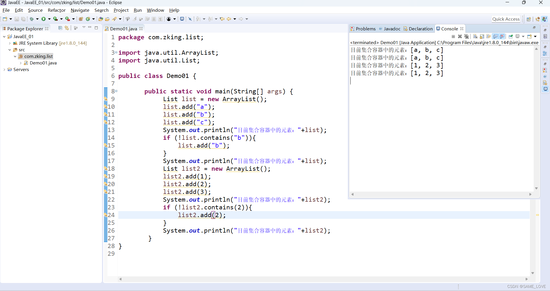 System.out.println("目前集合中的元素:"+list);//打印结果为: 目前集合中的元素:[a, b, c]