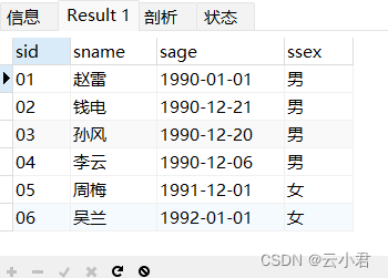 - Read(读取):从数据库中检索数据记录。使用 SELECT 语句来查询表中的数据行,获取所需的数据。