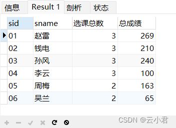 07)查询所有同学的学生编号、学生姓名、选课总数、所有课程的总成绩(没成绩的显示为 null )