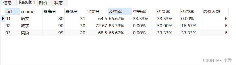 以如下形式显示:课程 ID,课程 name,最高分,最低分,平均分,及格率,中等率,优良率,优秀率及格为>=60,中等为:70-80,优良为:80-90,优秀为:>=90