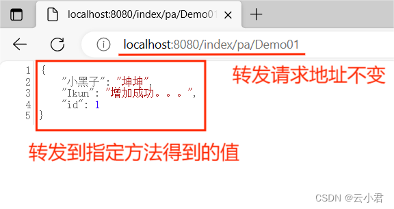 它相当于“request.getRequestDispatcher("url").forward(request,response)”。使用转发,既可以转发到jsp, 也可以转发到其他的控制器方法。