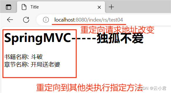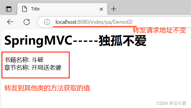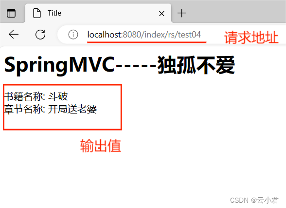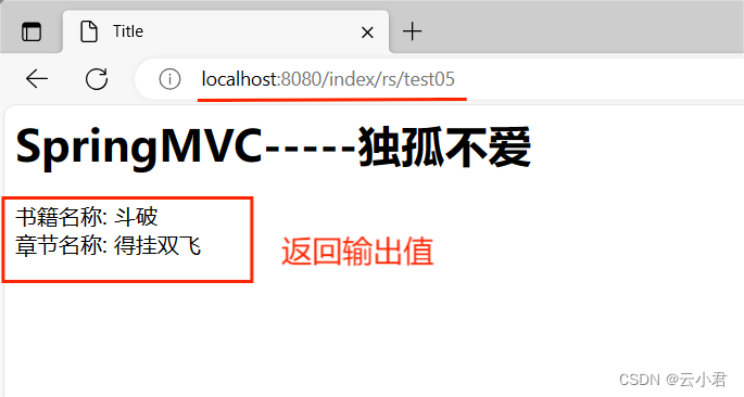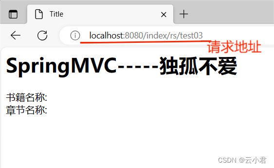 <%@ page contentType="text/html;charset=UTF-8" language="java" %> <html> <head> <title>Title</title> </head> <body> <h1>SpringMVC-----独孤不爱</h1> 书籍名称: ${name}<br> 章节名称: ${chapter} </body> </html>