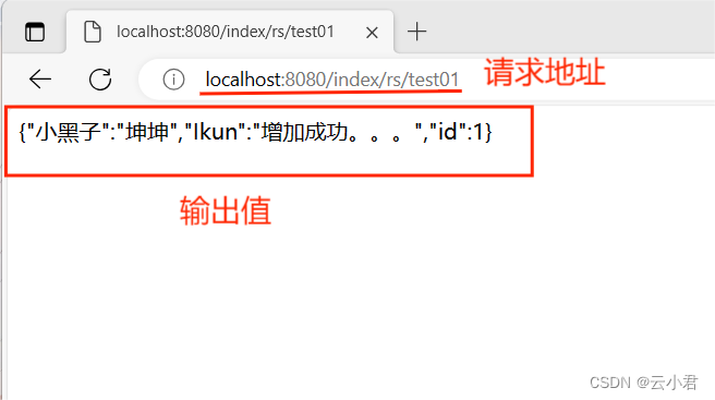 localhost:8080/index/rs/test01localhost:8080/index/rs/test01 (该请求地址是根据自己的注解配置来进行输入方可)localhost:8080/index/rs/test01