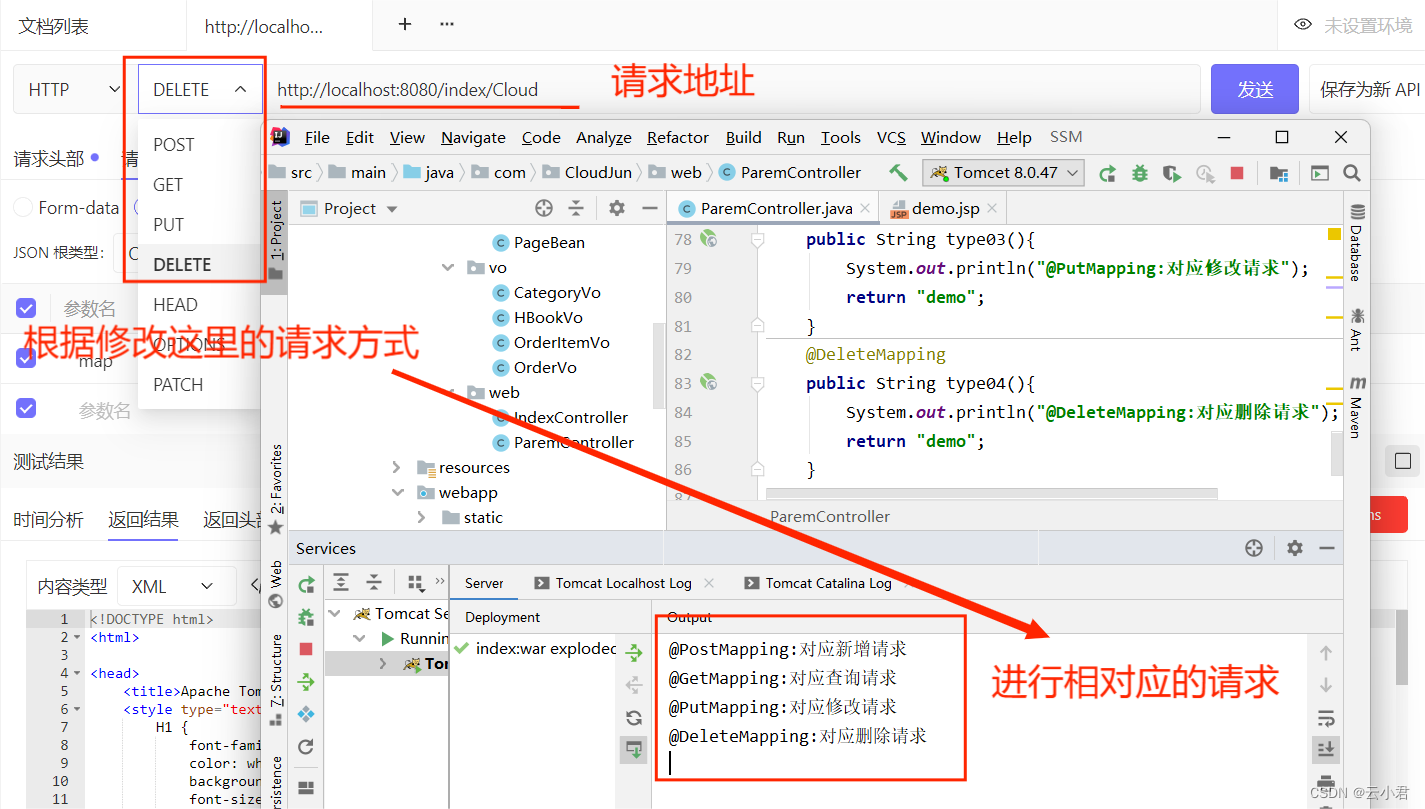 @GetMapping public String type01(){ System.out.println("@GetMapping:对应查询请求"); return "demo"; } @PostMapping public String type02(){ System.out.println("@PostMapping:对应新增请求"); return "demo"; } @PutMapping public String type03(){ System.out.println("@PutMapping:对应修改请求"); return "demo"; } @DeleteMapping public String type04(){ System.out.println("@DeleteMapping:对应删除请求"); return "demo"; }对以下四个方法分别进行请求,请求该方法相对应的请求方式进行参数