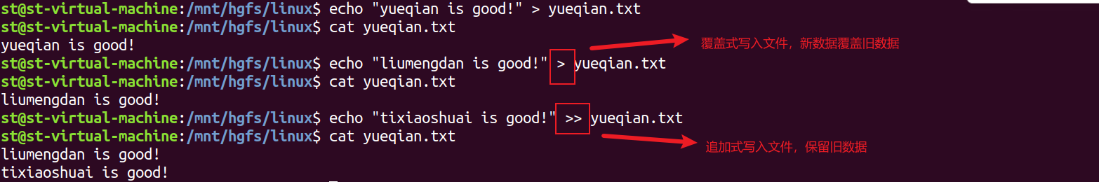 echo "tixiaoshuai is good!" >> yueqian.txt