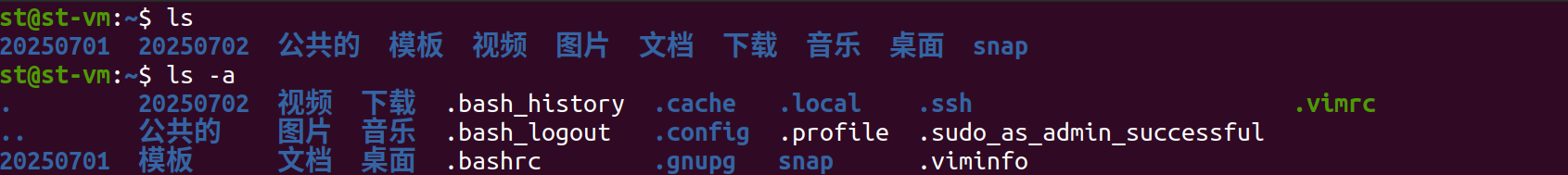 -a:显示所有文件或目录(包含隐藏文件或目录,Linux中的隐藏目录或者文件一般以.开头,如:.vimrc) -