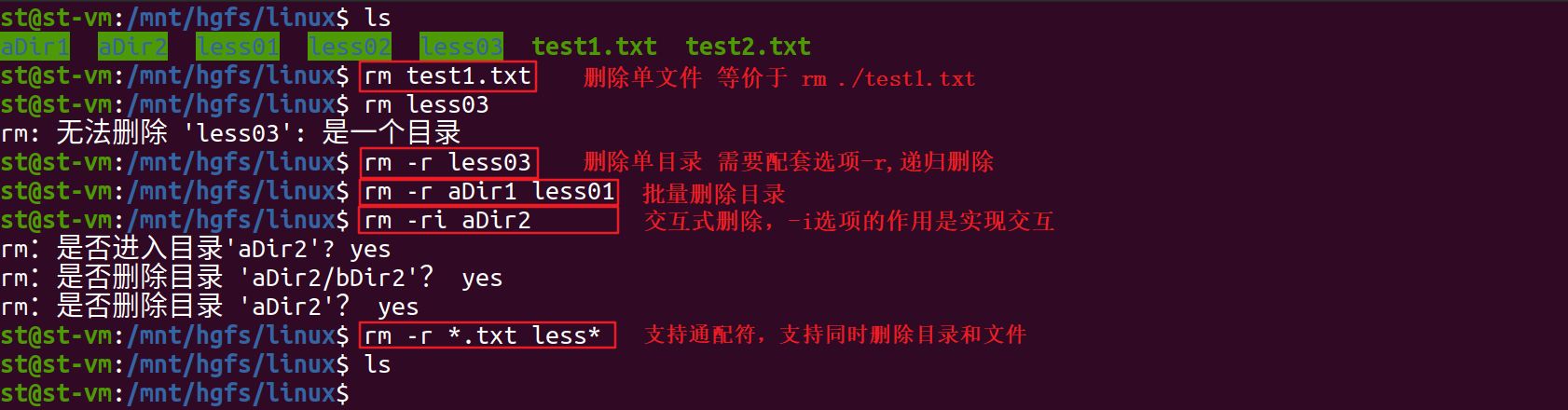 文件删除,直接删除就可以了,目录删除或者目录 + 文件删除,需要使用选项 -r 进行递归删除。另外,使用rm -f 可以强制删除文件或目录,不进行确认提示,但使用时需谨慎,因为删除后数据无法恢复。