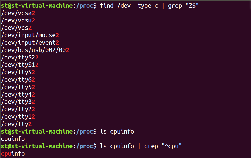 find /dev -type c | grep "2$" // 查找/dev下文件类型为c的以2结尾的所有文
