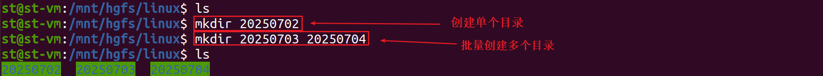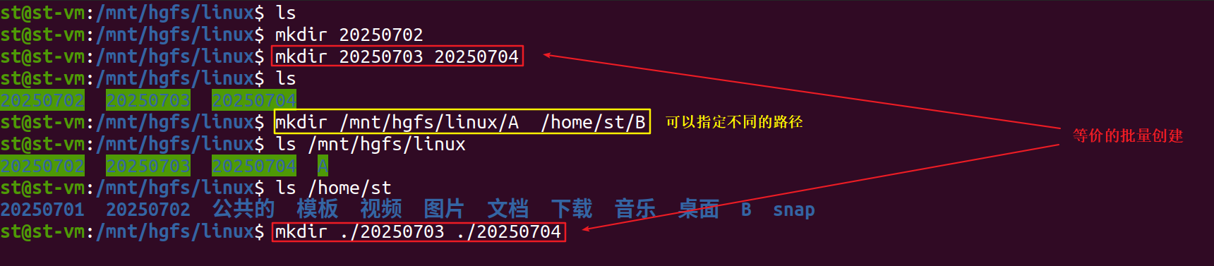 mkdir 目录路径列表 -- 解释:批量创建多个目录