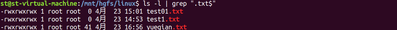 ls -l | grep ".txt$" // 以详细列表的形式显示文件名称为.txt结尾的文件