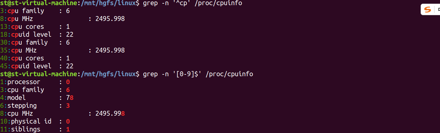 grep -n '^cp' /proc/cpuinfo -- 解释:匹配以cp开头的字符序列 -