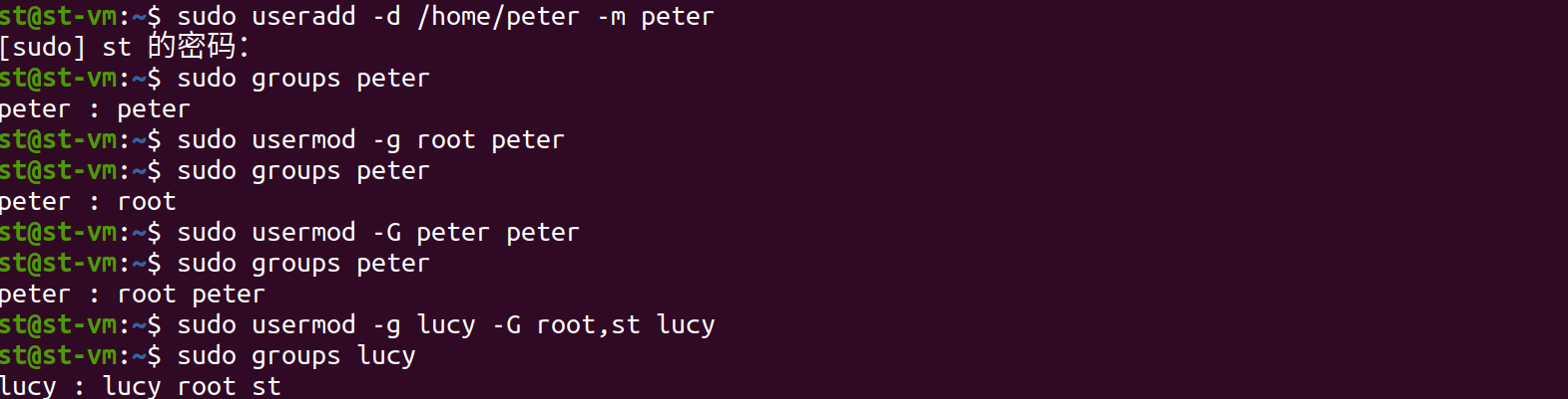 sudo usermod -g lucy -G root,st lucy