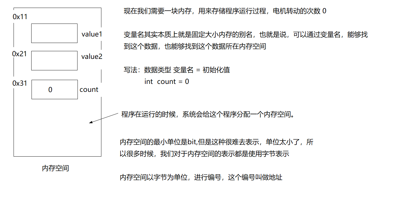 // 解释:向内存申请一块存储空间,并给这个空间添加一个初始数据