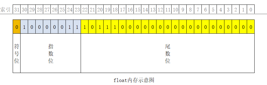 用二进制表示就是符号位(1位)、指数位(8位)、尾数位(23位),最终显示: