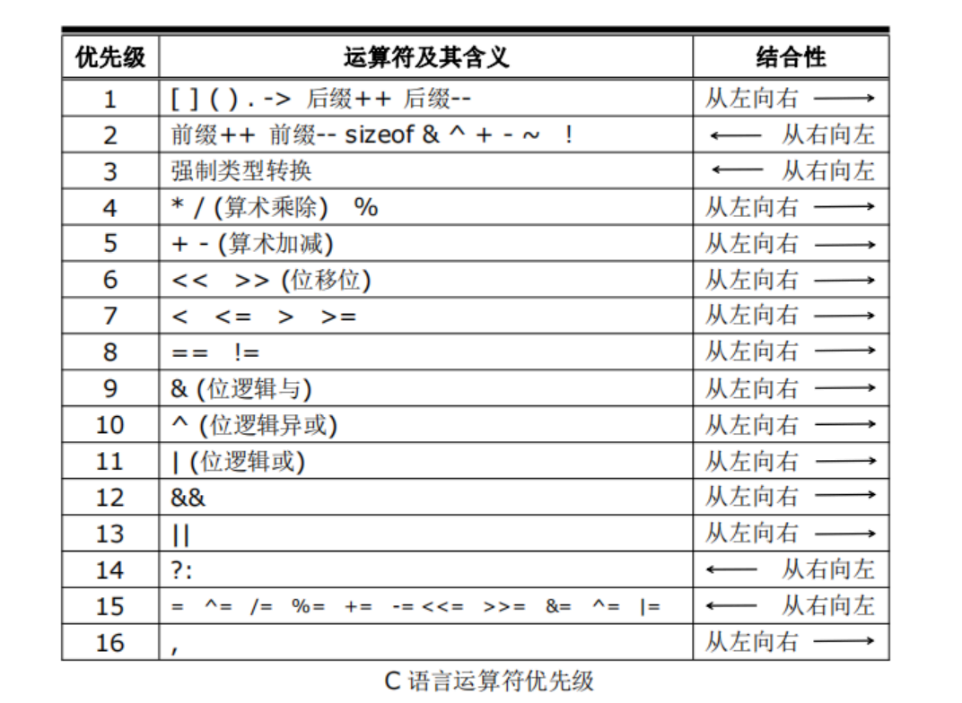 C语言规定了运算符的优先级和结核性。在表达式求值时,按运算符的优先级的高低次序执行。如果运算符对象两侧的运算符优先级相同,如a +b +c,则按照规定的“结合方向”处理。