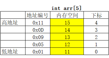 int arr[5]:在内存中开辟连续的5块空间,每一块空间的大小是4个字节。