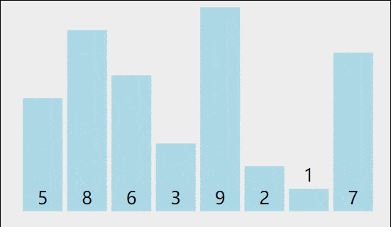 每次排序假定第一个元素是最大或者最小的,然后相邻的两个元素依次进行比较,遇到较大或者较小的元素进行交换,访问完数组的最后一个元素,就排好了一个数。