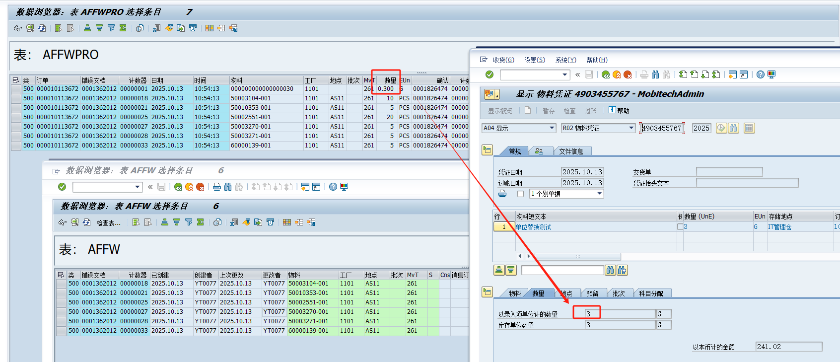 错误文档0001362012最开始是7条记录,同时写入表AFFW和表AFFWPRO。COGI修改数量(0.3修改成3)清除这行错误,于是表AFFW变成6条记录,AFFWPRO表还是7条记录。