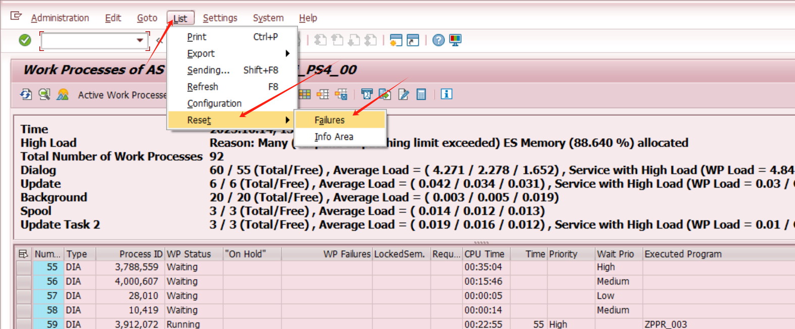当系统进程异常终止的后,通过SM50会看到失败的次数(Work Process Failures),通过下面路径可以重置这个错误计算器。