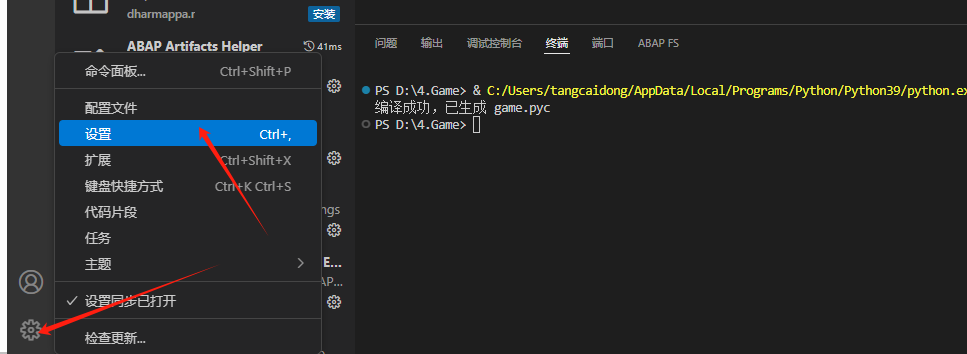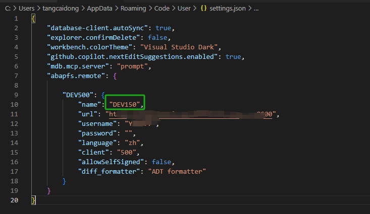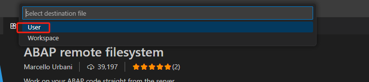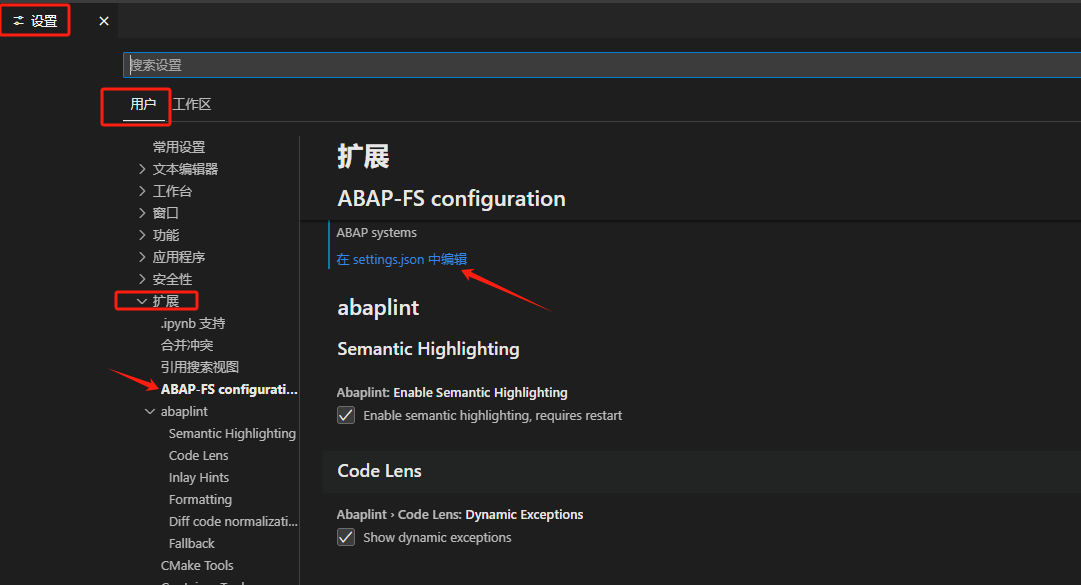1、打开配置文件:Settings->User->Extensions->ABAP-FS configuration->Edit in settings.json
