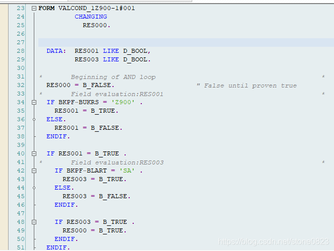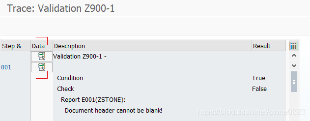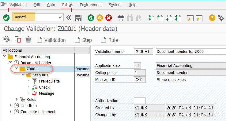假设我们需要这样一个凭证的校验规则:如果公司代码为 Z900 并且凭证类型为 SA,则凭证的抬头文本不能为空。因为是对凭证抬头校验,所以使用 1 作为 calling point。