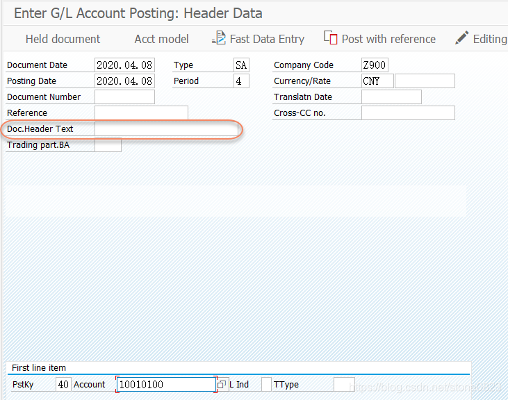 录入一张会计凭证,故意将 Document header text 留空。