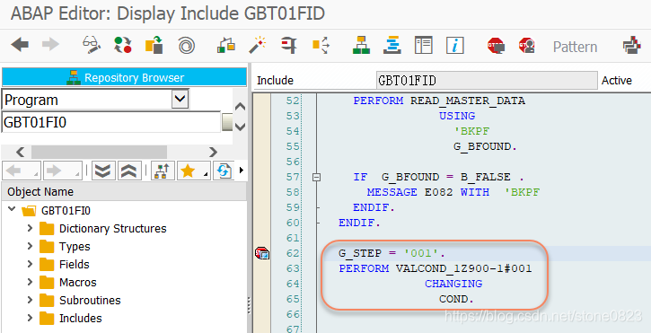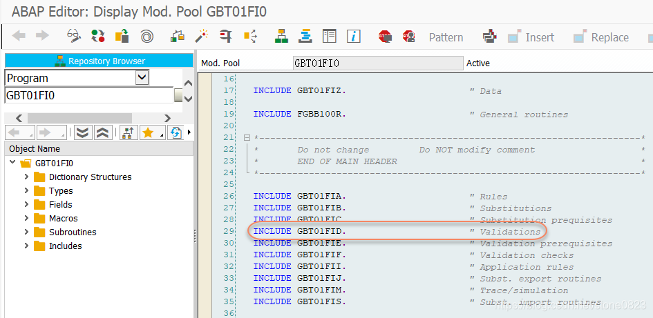 由此我们知道,刚才创建的 validation,系统生成的程序名为:GBT01FI0。通过代码后面的注释,我们知道 Validation 的代码在 include GBT01FID 中,如下图。