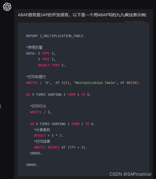 chatGPT在执行重复性任务和代码编写上展现高效,但其代码不完善且缺乏创新力,不能完全取代人工。尽管能提高某些工作效率,尤其在处理ABAP语言的九九乘法表等基础任务,但复杂和创新的工作仍需人类参与。