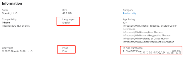 根据苹果官网,该应用仅支持英语,年龄分级为“12岁以上”。下载应用是免费的,但会提供App内购买项目——目前仅有售价19.99美元的“ChatGPT Plus”。