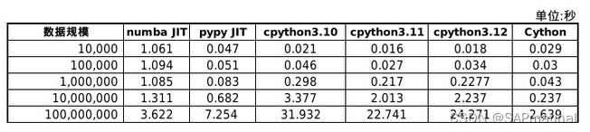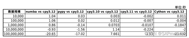 下面该表是各个Python实现或Python编译器的时间开销减去CPython3.12的时间开销的差值,得出数据表。