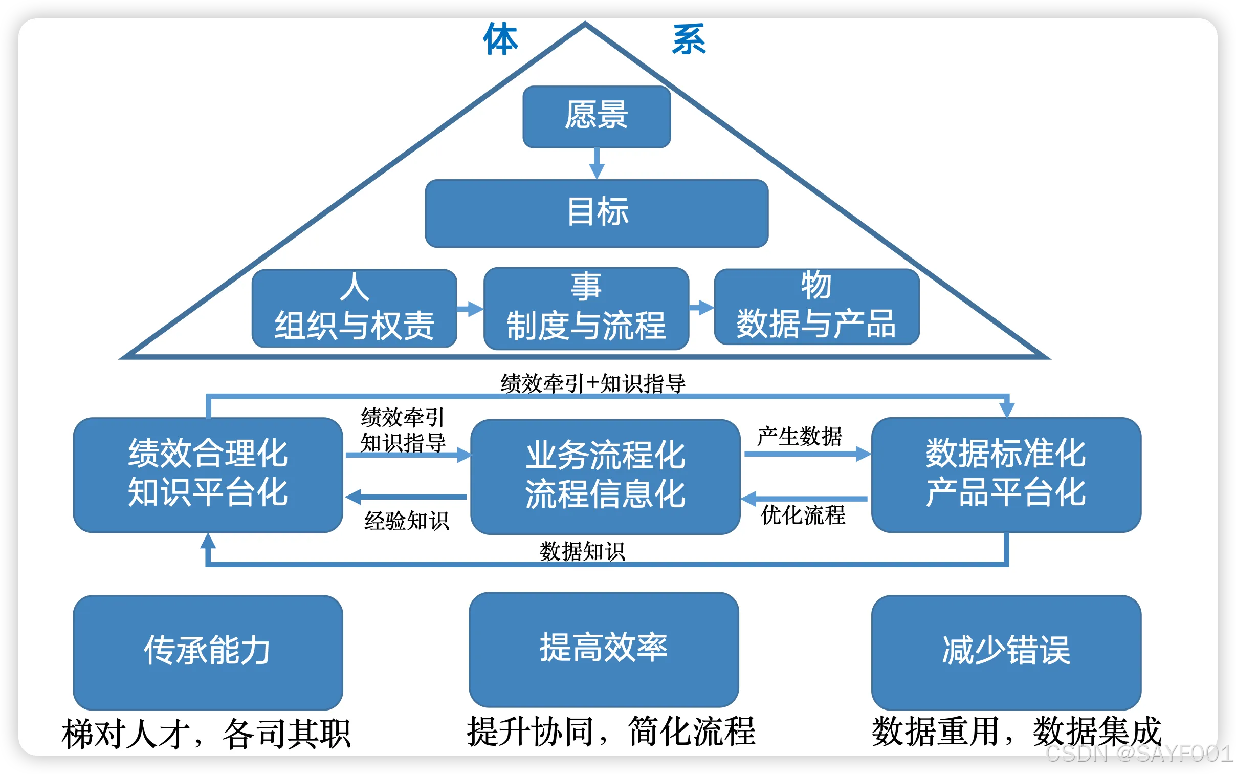 上一篇讨论了研发体系,这一篇我详细来说一下研发体系的中的组织、流程、数据三者的关系。目的是通过绩效牵引和知识指导,不断优化业务流程,建全数据标准以实现整体业务的高效运作和持续发展。