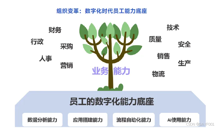 企业需要围绕财务、采购、营销、技术、质量、安全、销售、生产、物流等部门的实际业务需求,着力培养员工的四大数字化核心能力,分别是数据分析能力、应用搭建能力、流程自动化能力和AI使用能力。只有做到这一点,企业才能成功实现从传统运营模式到智能化、高效化运营模式的转变。