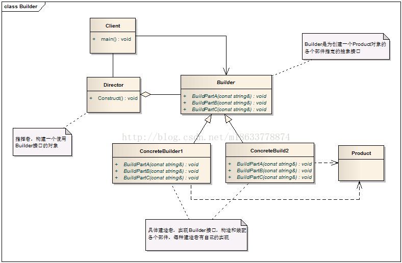 1.将一个复杂对象的构建与它的表示分离,使得同样的构建过程可以创建不同的表示