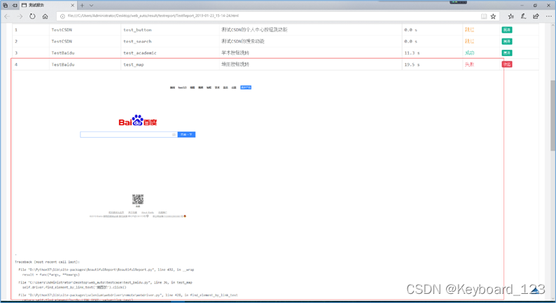 此部分介绍的非多线程内容,前面有提到,BeautifulReport模块有一个截图功能,可以将截图放在测试报告对应的用例中,这个功能是极好的,所以在这里补充介绍一下。