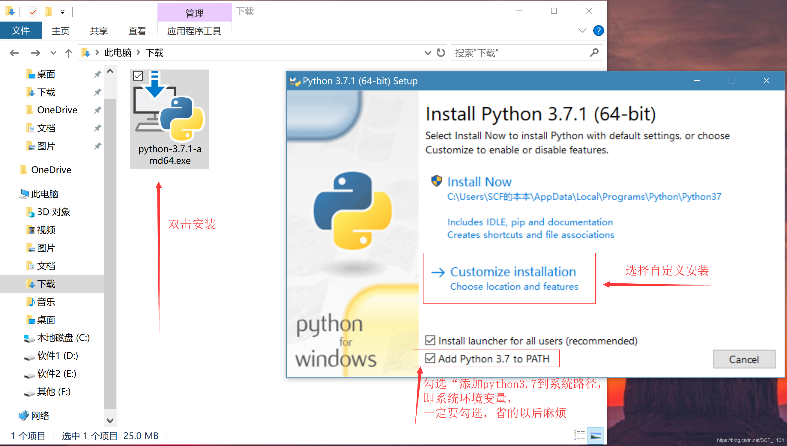 再说明一下,一定要将“Add Python3.7 to PATH”勾选上,为的就是省却后面再次添加环境变量的麻烦。这儿一定要勾选!一定要勾选!一定要勾选!三遍不多说,然后选择自定义安装。