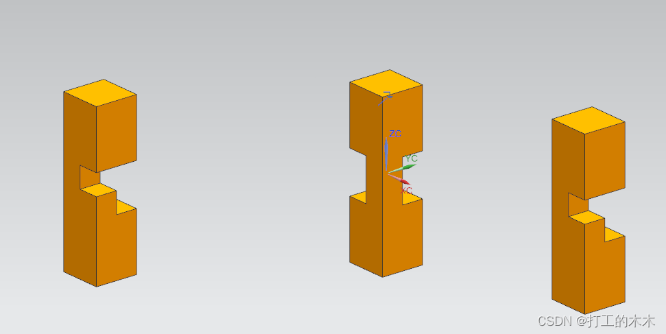 2、首先在草图绘制一个20*75的长方形,两侧拉伸(总厚度20)。再将其中心部位剪切成图二所示,高度20,第二次减去部分为10*10的一片区域,即为组件2。