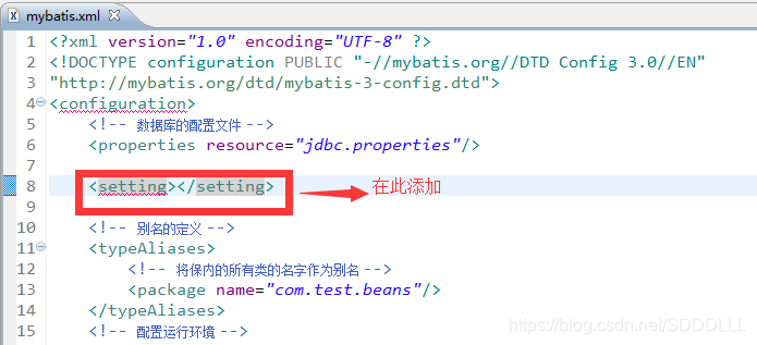 在mybatis.xml文件的<properties/>和<typeAliases/>标签之间,添加<setting/>标签,用于完成全局参数的设置。因为标签的书写位置,是定义好了的。