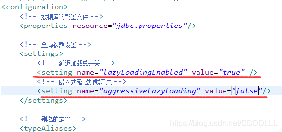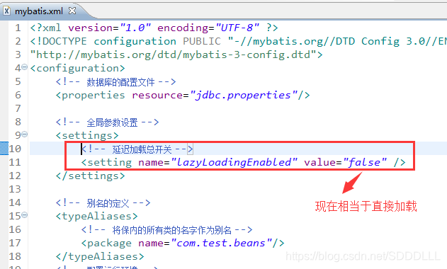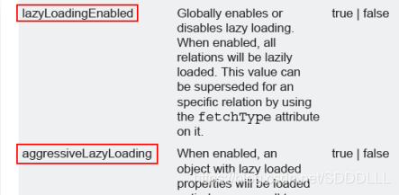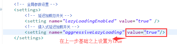 根据上图的说明:全局属性的lazyLoadingEnabled是延迟加载的一个总开关。当其值设置为false时候,那么将采用直接加载。