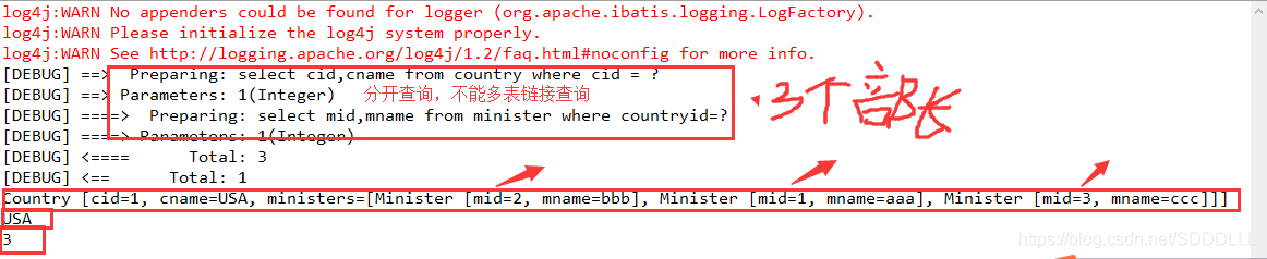 当执行到country.getCname时候,不会去查询minister表。但是当执行到下一个输出的时候,会立刻访问minister表。这是因为此时需要访问country的详情,但是minister的详情作为其一部分,此时需要用到minister,会立刻访问minister。