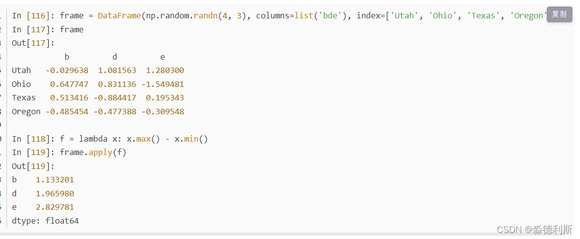 1.apply()是一种让函数作用于DataFrame中行或列的操作。
