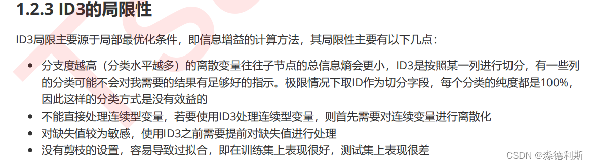 ID3局限性主要是,对缺失值敏感,无法处理连续型变量,没有剪枝的设置。