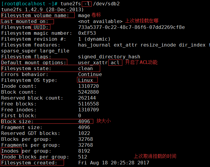 (3)tune2fs:修改文件系统信息,重新设定ext 系列文件系统可调整参数的值 例:tune2fs -o acl /dev/sdb2 开启/dev/sdb2的acl功能