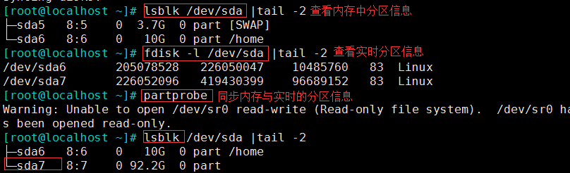 partprobe 新增分区,删除分区都可以,centos 5和7可以使用,centos 6中有bug