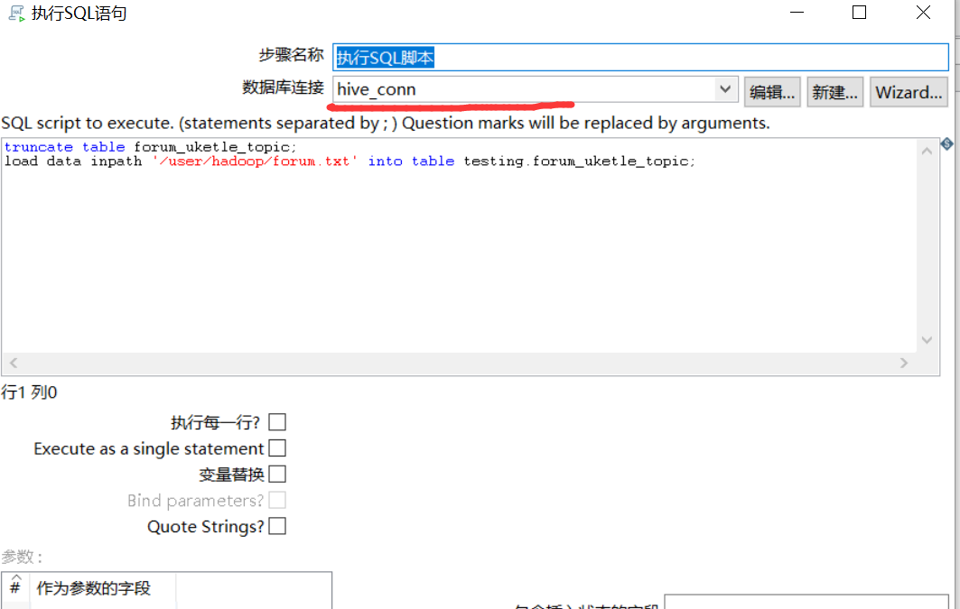 使用步骤1创建的hive连接,连接hive,然后通过如下脚本,将数据从hdfs里面导入到hive。