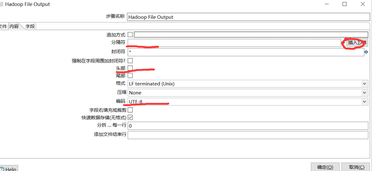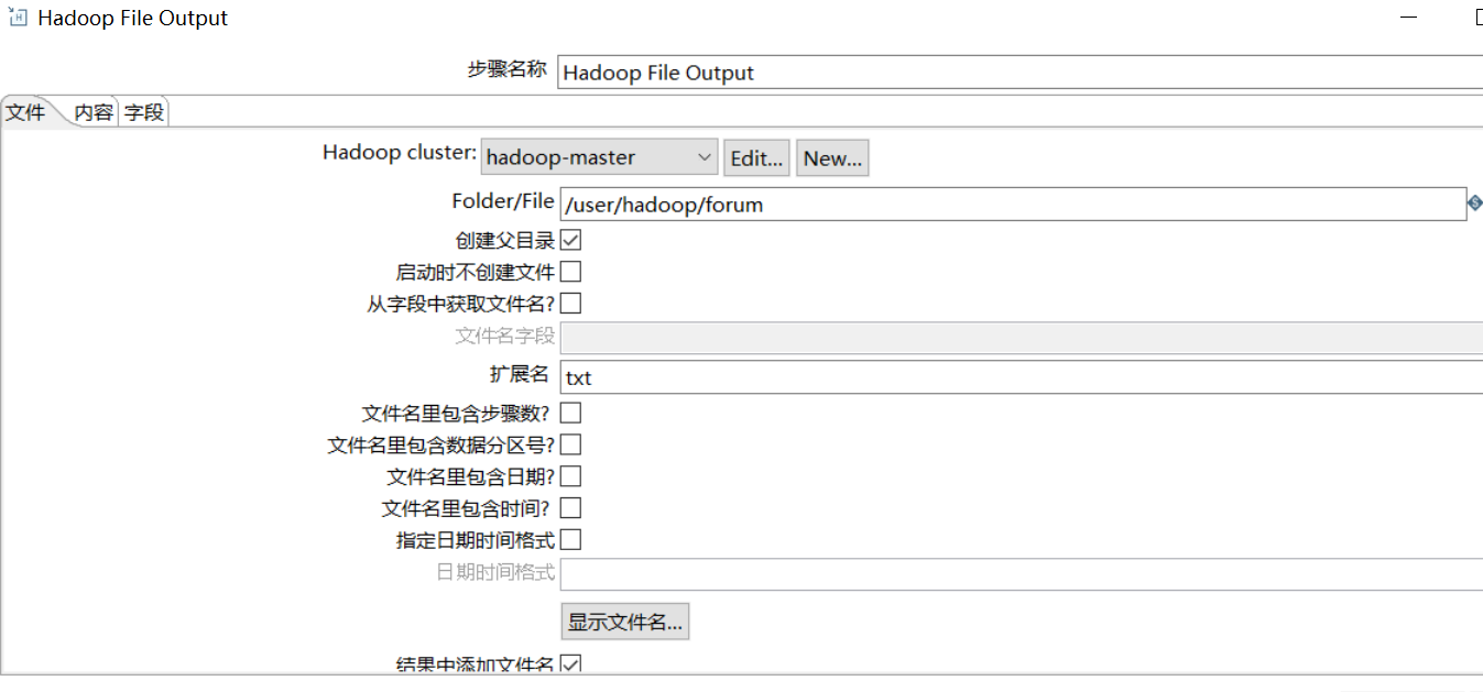 hadoop file output 组件配置如下: