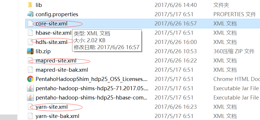 从服务器hadoop etc的配置文件中下载如下4个配置文件,覆盖kettle的plugins\pentaho-big-data-plugin\hadoop-configurations\hdp25中的4个同名文件。