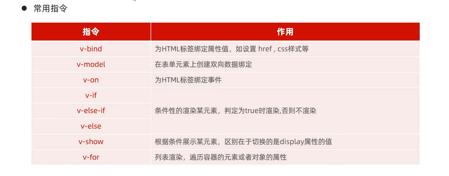 - 指令:HTML标签上带有v-前缀的特殊属性,不同属性具有不同的含义,例如:v-if,v-for...