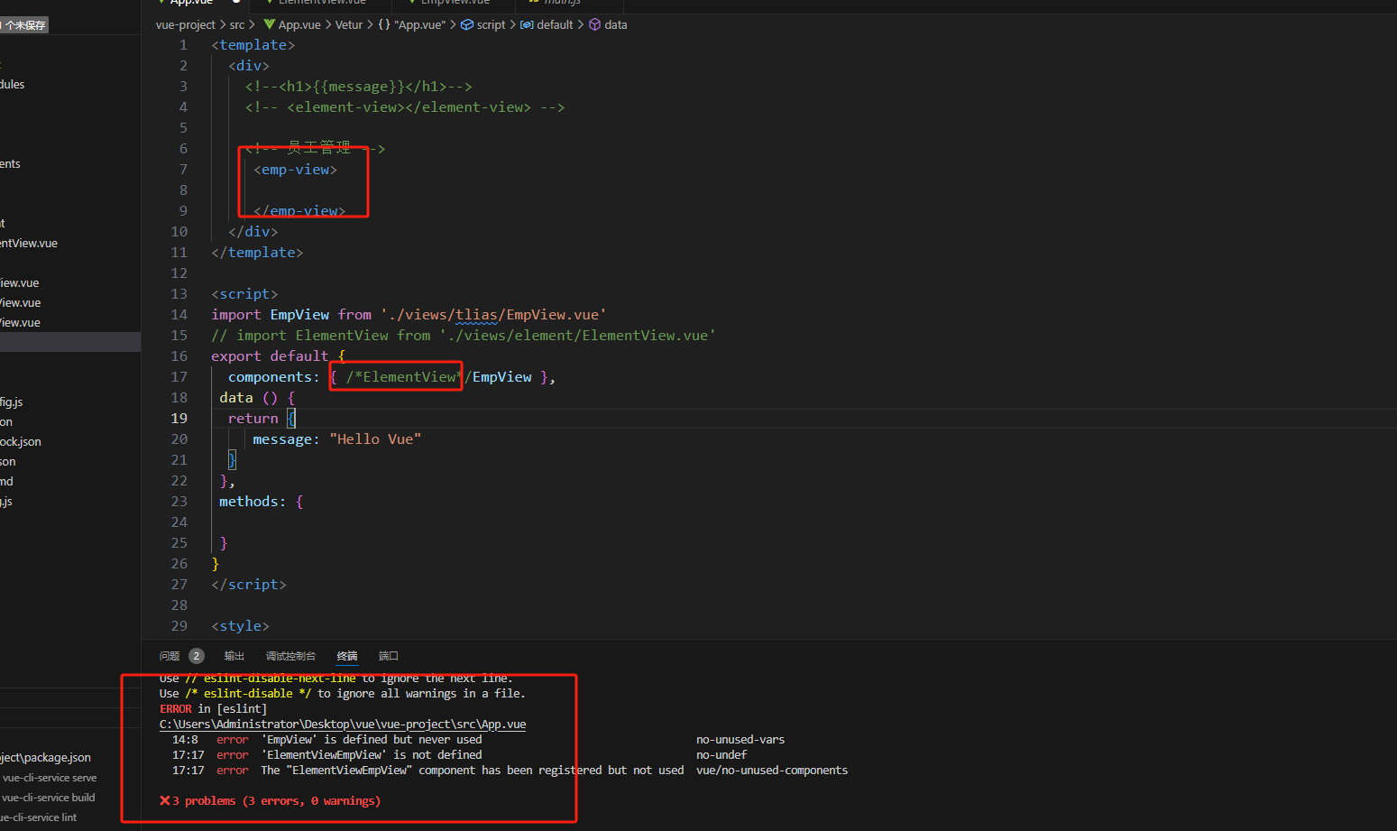 - 引入新的EmpView时报错,问题是虽然引入了EmpView,但是components中ElementView未注释掉