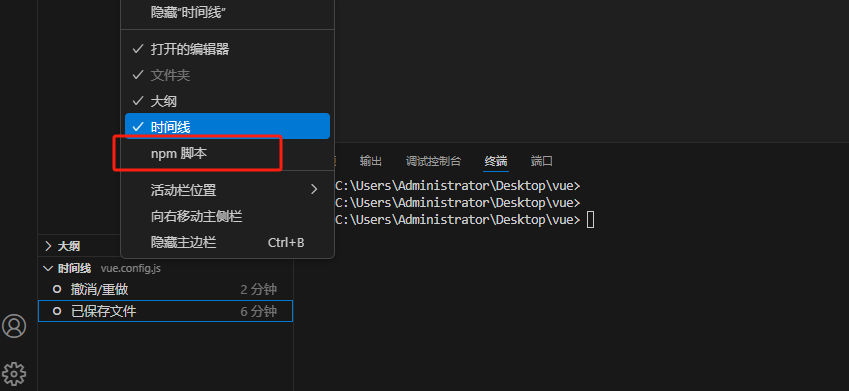 - 解决:右击时间线,选择勾选npm脚本