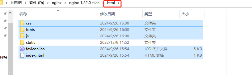 - 部署-nginx:将打包好的dist目录下的文件,复制到nginx安装目录的html目录下